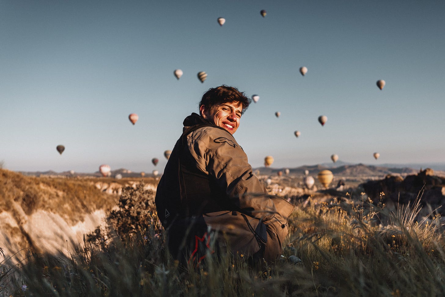Day 10 - 4h45 am is a bloody early time to wake up, but we decided to go for it, and I'm glad we did. When I looked out of the tent, there they were—hundreds of hot air balloons taking off from their launch site in Cappadocia, floating up and gliding through the valleys below. I've seen tons of pictures, but being surrounded by all those balloons right outside my tent was just incredible. After packing up and grabbing some espressos at a local café in Göreme, we checked out the Love Valley with its huge, unmistakably phallic rock formations. Realizing we couldn't compete, we headed east. We decided to set up camp early and cook, and a nice farmer even brought us some mushrooms just before the rain started to come down.