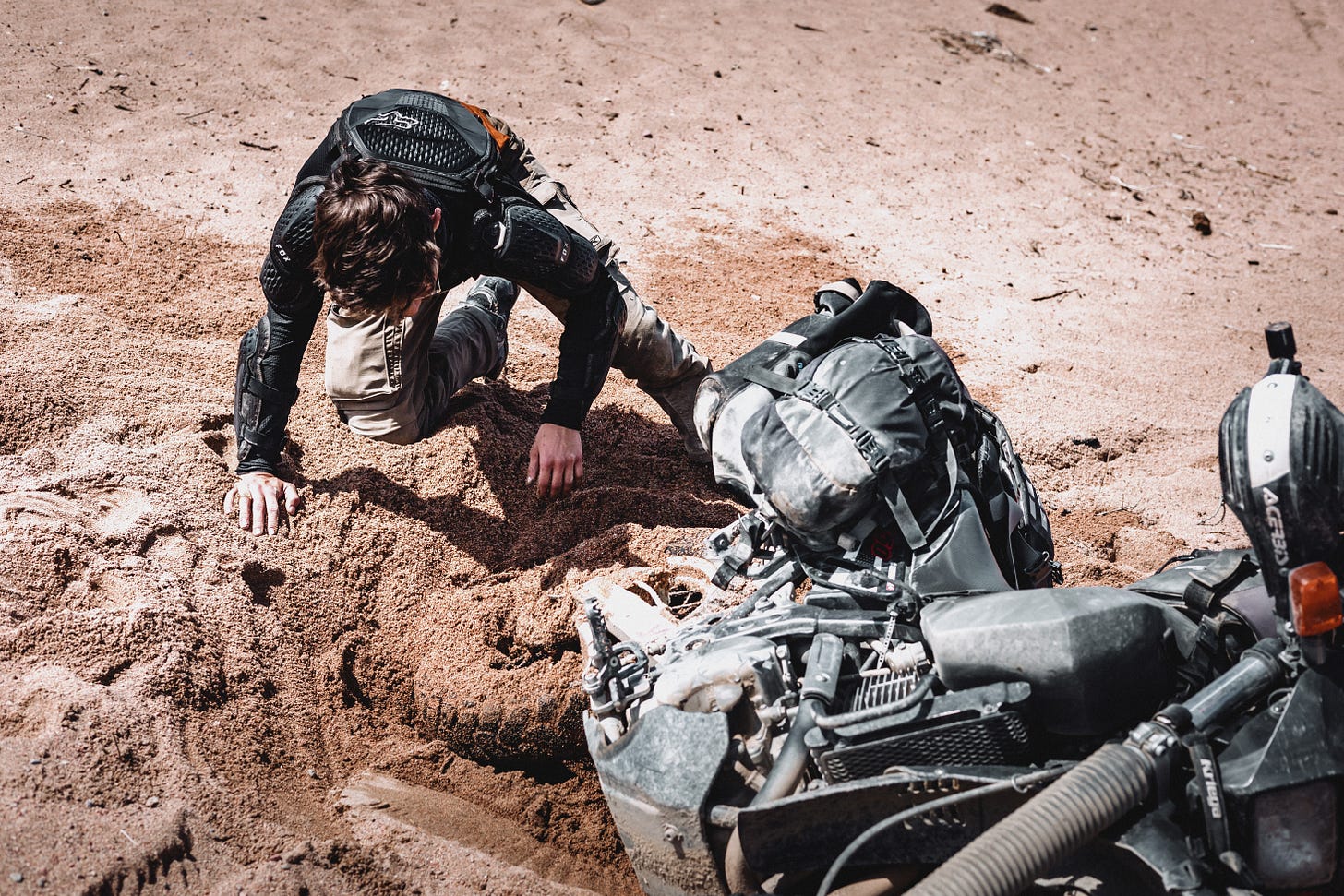 Day 91 - After we packed up at our fantastic lakeside spot, we took a little break in the sand before continuing our journey along the south shore of Lake Issyk Kul towards Karakol. Gion’s back wheel spun, and just 10 seconds later, half of the bike was buried in the sand. The first step is to take off the luggage, and the second is to clear the sand around the bike. There’s no way to just ‘ride’ the bike out of this sand. The only option is to wiggle the bike left and right until we can lay it down, turn it to get it out of the hole, and then lift it back onto the flat sandy surface and ride off slowly. After 30 minutes and a lot of cursing, we’re finally on our way.