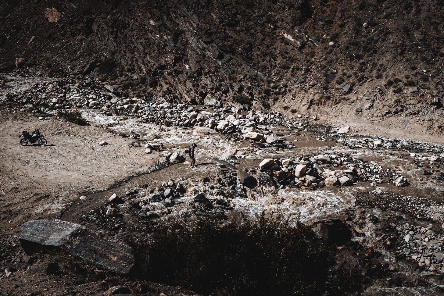 Day 71 River crossing - A tricky moment in the Wakhan valley is crossing the river just after Langar when moving east to west. It's usually recommended to cross in the morning when the river has significantly less water, but we decided to attempt the crossing at 3 pm since we wanted to avoid camping there. We reduced the weight of our bikes to make them less likely to tip over and carried most of our equipment across the river on foot. After assessing the depth and the best route, we took the plunge and successfully got both bikes across the river without any falls. Ethan and Sal, whom we had met earlier, confirmed that the river had much less water the following morning when they crossed around 9 am with their Hondas.