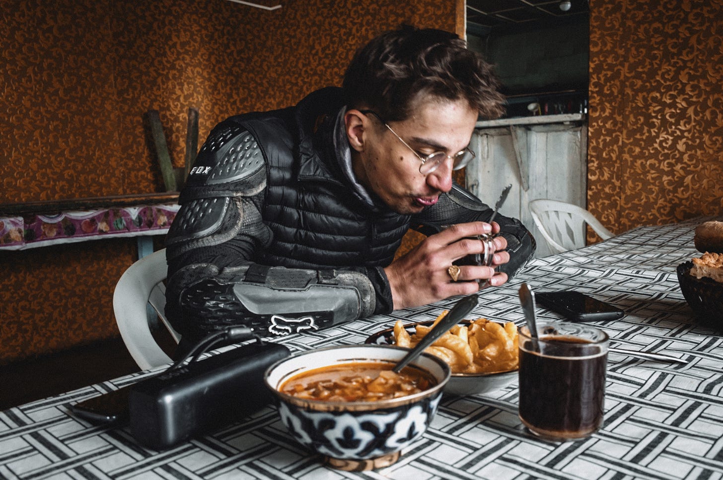 Day 72 cont. - After navigating the washboard section and enduring heavy rain, we desperately needed a break and a hot meal. We're back on the Pamir Highway, where most of the road is easily drivable tarmac here. What a relief after spending days on some of the toughest roads out here. The plateau is breathtaking, even in the rainy weather, and we took some detours off the tarmac onto dirt roads and open terrain just for fun. I felt an incredible sense of freedom as I rode towards distant peaks on this high mountain plateau covered with dirt, sand, and small bushes. Standing up on the bike and soaring towards the horizon was simply exhilarating. Eventually, the M41 guided us to Murghob, where we checked into the Guesthouse Aruf, greeted by the smile of its super friendly owner. "Lentil soup? Chicken?" Yes, please.